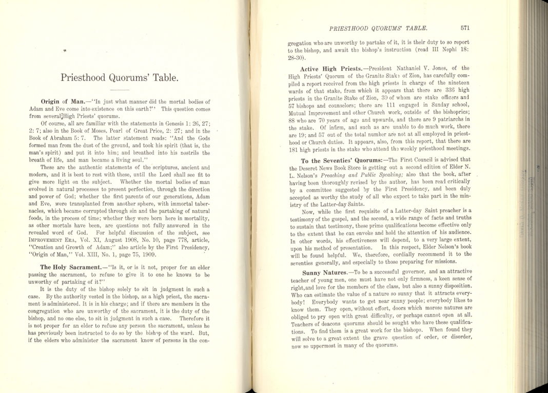 This statement appeared in the “Priesthood Quorums’ Table” with no attribution and it has never been known who the author was. The Priesthood Quorums’ Table was the method by which the General Priesthood Committee communicated with the local quorums. One thing we know for certain is that the article was not written by Joseph F. Smith or the First Presidency as claimed by Evenson and Jeffery.1 The first evidence is that, as I mentioned above, there was no signature on the article. Realize that the Improvement Era contained numerous anonymous comments and articles on various religious and secular topics. The articles that were written by the First Presidency, by President Joseph F. Smith or by other leaders such as The Origin of Man” published in 1909 and “The Father and The Son: A Doctrinal Exposition by The First Presidency and The Twelve” published in 1916 are clearly distinguishable as to who the author or authors are. Some believe that the article cited above was written by someone on the General Priesthood Committee, but we will probably never know in this life as articles were published by many who were not members of the General Committee. It could have been written by any member of the Church. The articles that President Smith or others wrote always bore their names, where this 1910 message was unidentified.The next evidence that President Joseph F. Smith did not write the statement as is often indicated is that at that very time, the years 1910 and 1911, President Smith removed three BYU faculty members for their persistent teaching of organic evolution and higher criticism. It would be very inconsistent to make the statement you have attributed to him while acting in this way. This history has been documented by various sources.